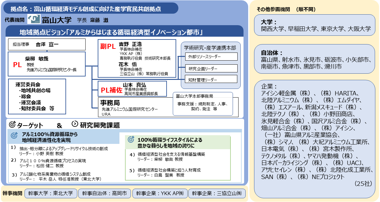 今後現実化する循環経済を推進する人材育成を進めると共に、産官学民で社会変革を進めるエコシステム(共創拠点)を構築します。これらの活動を通じて、富山で資源循環社会モデルを創成し、日本全体に横展開をすることで、富山県の工業の持続的発展、我が国のアルミ産業の発展、地球規模での環境保護等に貢献します。