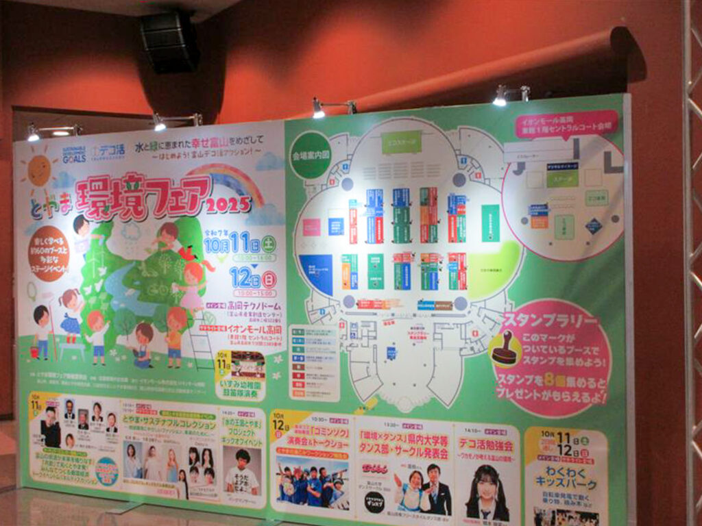 「とやま環境フェア」は、地球温暖化防止や資源保全の重要性を広く伝えることを目的に、毎年開催されており、今年は高岡テクノドームがメイン会場。パネルディスカッションやステージショーも多くあり、2日間で11,000名の来場者で賑わいました。