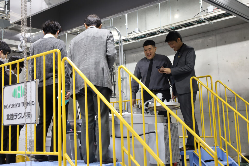 2日目は研究拠点である富山大学高岡キャンパス内の「軽金属材料共同研究棟」の見学を実施しました。アルミニウム溶解精錬システムや400MT直間複動押出し加工プレス機などの研究設備について解説が行われ、参加者から積極的な質問が寄せられました。
