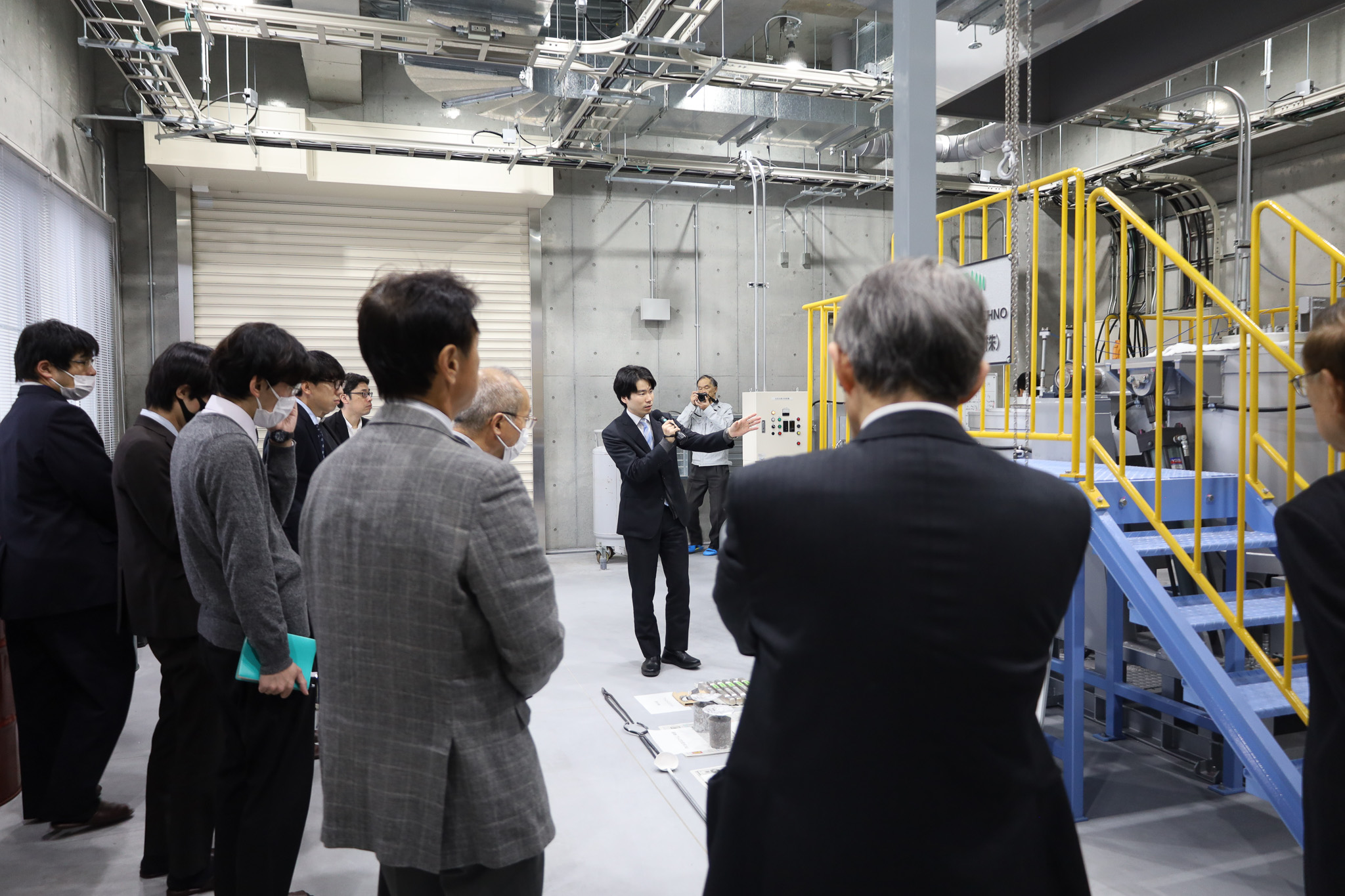2日目は研究拠点である富山大学高岡キャンパス内の「軽金属材料共同研究棟」の見学を実施しました。アルミニウム溶解精錬システムや400MT直間複動押出し加工プレス機などの研究設備について解説が行われ、参加者から積極的な質問が寄せられました。