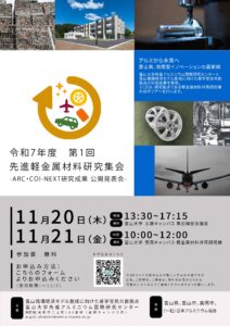 令和7年11月20日(木)~11月21日(金)富山大学(五福キャンパス・高岡キャンパス)にて、「令和7年度 第1回 先進軽金属材料研究集会 -ARC・COI-NEXT研究成果公開発表会-」を開催いたします。