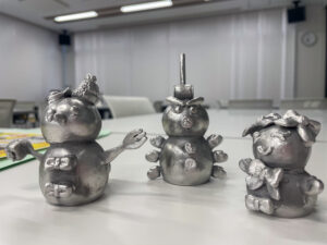 参加者は雪だるまをモチーフにしたアルミオブジェの原型づくりに挑戦。ろうで成形された頭と胴体に、帽子、耳、鼻などのパーツを、ホットペンを使って自由に組み合わせ、個性あふれる作品が生まれました。「パーツを溶かして付けるのが楽しかった」「どんな雪だるまになるか楽しみ^^」と話す声も聞かれ、創作の時間は大いに盛り上がりました。