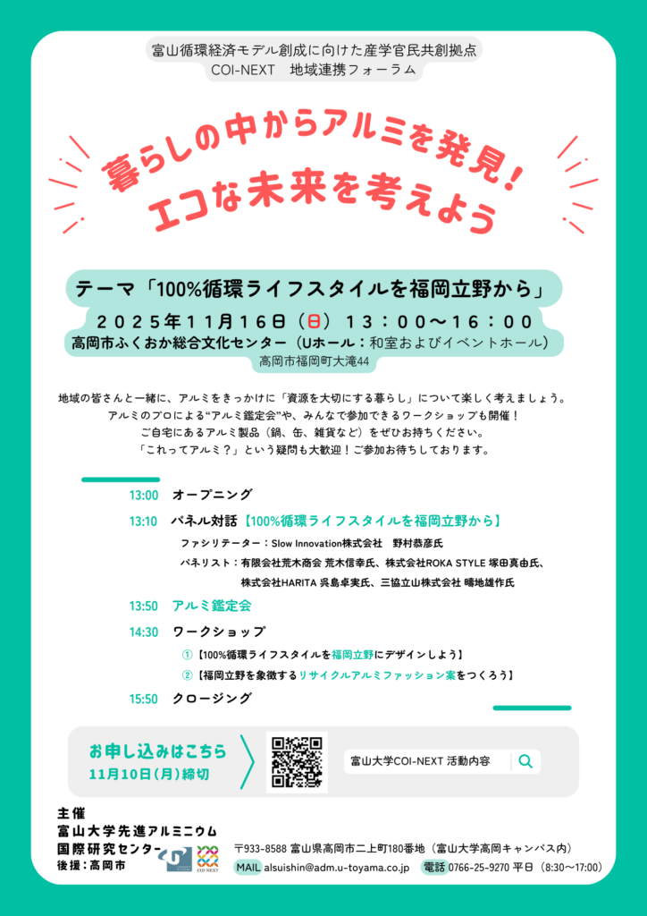 令和7年11月16日高岡市ふくおか総合文化センター(Uホール)にて、「暮らしの中からアルミを発見!エコな未来を考えよう」のイベントを開催いたします。